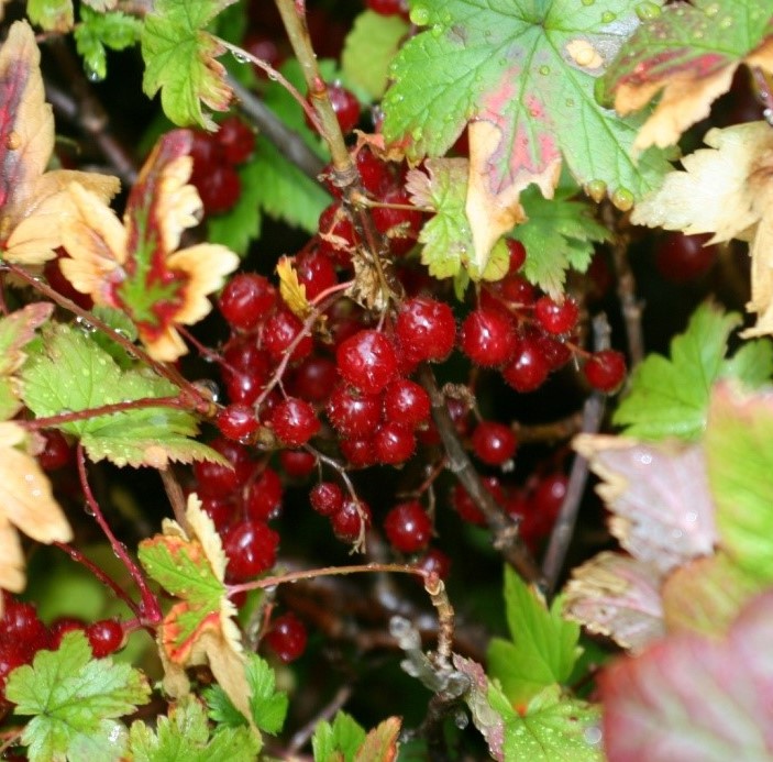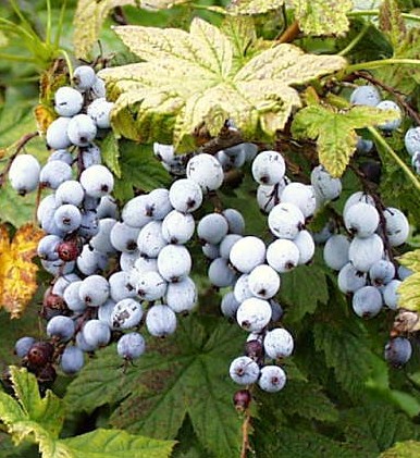 ![]() | Blárifs ‘Perla’ | Ribes bracteosum | Skuggþolinn, um 1,5 m hár og breiður runni með stór blöð sem minna á hlynblöð. Berin eins og perlur á snúru, svört með ljósbláu vaxlagi. Fullþroskuð í ágúst. Sérkennilegt bragð sem passar t.d. með villidýrabráð. Njótist fersk og fín í sultur. |