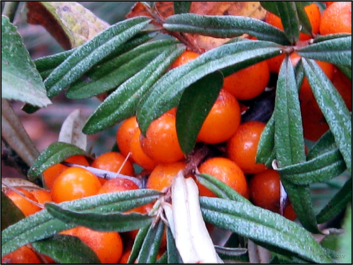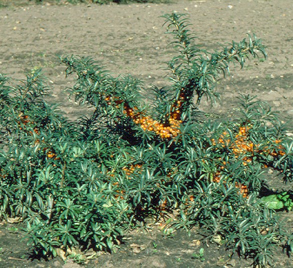 ![]() | Hafþyrnir ‘Eva’ | Hippophae rhamnoides ‘Eva’ | Kvenkyns yrki. Finnskt. Nokkuð hár runni, um 1,5 hár og breiður með oddhvassa greinþyrna. Gulrauð, safarík ber. Þroskast í september-október. |