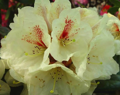 ![]() | ‘Bohlkens Snow Fire’ (yakushimanum hybrid) | Hvítur með rautt gin | Lágvaxin |